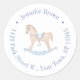 Este simples e flexível design de autocolante apresenta um cavalo de balanço de madeira pintado manualmente com cor d'água com sotaques azuis claros. Mostrado aqui para um adesivo de endereço de retorno, mas todos os campos de texto são flexíveis para suas necessidades. Por exemplo, pode ser um obrigado que você favorece.