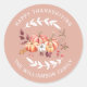 Adesivo de endereço de devolução redondo do Dia de Ação de Graças com o seu nome em tipografia branca estilosa apresenta o texto 'feliz dia de ação de graças' e um toque estiloso de folhagem rústica, abóboras aquarela. folhas e bagas em um fundo dusty pink. Basta adicionar o seu nome e endereço. Exclusivamente projetado para você pelo Happy Dolphin Studio. Se precisar de ajuda ou produtos correspondentes, entre em contato conosco através do nosso chat de loja. Feliz Dia de Ação de Graças!