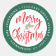 Adicione um detalhe colorido e divertido de feriado aos seus cartões de Natal, convites de festa e outras correspondências durante a temporada de Natal com este selo de envelope de endereço de devolução redondo festivo. O design apresenta o script de caligrafia 'Merry Christmas' e seu endereço de devolução em um fundo verde escuro.