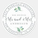 Chic, moderno e simples retorno de casamento, escrevem o clássico adesivo redondo com o texto do futuro Sr. e Sra. em um roteiro de caligrafia elegante fora de preto sobre um fundo branco e um toque na moda de folhagem verde de eucalipto. Basta adicionar seu nome e endereço. Desenvolvido exclusivamente para você pelo Happy Dolphin Studio.