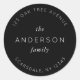 Adesivo Redondo Clássico com Nome da Família Preto e Endereço apresenta seu sobrenome e endereço em branco sobre um fundo preto. Confira os itens de casamento correspondentes https://www.zazzle.com/collections/119930609931325936