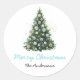 Adicione um toque festivo à embalagem das suas festas de fim de ano com este adesivo de árvore de Natal elegante, lindamente adornado com enfeites de bola de discoteca em azul suave, prata e dourado. O design em aquarela apresenta “Merry Christmas” (Feliz Natal) em uma fonte moderna com o nome da sua família personalizado abaixo – perfeito para selar cartões, decorar presentes ou adicionar um toque caloroso a latas de biscoitos e brindes de Natal.