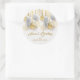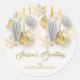 Um adesivo redondo apresenta seu nome comercial e saudação em letras quic acentuadas com um design de ornamentos de prata e ouro e flocos de neve. CORRESPONDENTE a itens na nossa coleção.
