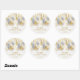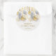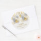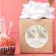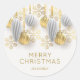 Um adesivo redondo apresenta seu nome e Feliz Natal saudando em letras quic acentuadas com um design de ornamentos de prata e ouro e flocos de neve. CORRESPONDENTE a itens na nossa coleção.