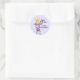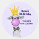 Obrigado de aniversário, você vacila com uma lama branca soprando uma bolha rosa enquanto mascina chiclete. Vestindo uma coroa dourada e uma gravata arco preta. Fundo roxo claro.