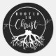 Enraizado no Cristo, este design apresenta um design preto e branco com raízes de uma árvore e texto dizendo "Enraizado no Cristo".