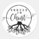 Enraizado no Cristo, este design apresenta um design preto e branco com raízes de uma árvore e texto dizendo "Enraizado no Cristo".