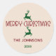 Elegante Pink e Green Deer Christmas Envelope Classic Round Sticker Estes mínimos de invólucro rosa pincelado são a adição perfeita ao seu papel de carta de férias. A design apresenta o Natal vermelho moderno e feliz com seu nome de família embaixo e o ano em verde. Duas renas verdes saltam na direção oposta para criar equilíbrio e elegância. Personalize o rótulo com suas informações para uma aparência personalizada moderna e na moda para seus cartões de natal e presentes. Pode transferir esta design em qualquer produto Zazzle. Se precisar de ajuda para a transferência, envie um e-mail para reviva.designs@gmail.com.