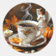 Bonito Tampões de outono com uma ilustração ai de uma caneca de café quente, fatias de laranja, bastões de canela, cercada por folhas de outono e uma abóbora.