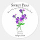 Arte digital Purple Sweet Peas com texto em adesivo. Flores roxas muito delicadas com texto Ervilhas doces no texto superior e inferior dos países de onde as flores são nativas e o nome botânico Lachyrus Odoratus.