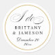 Um adesivo de casamento preto e branco elegante com "eu faço" em caligrafia e sotaque de borda dourada editável. Personalize também a cor de fundo.
