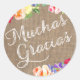 Fundo de efeito de renda de burlap com flores de cor d'água brilhantes. Os adesivos têm texto "Muchas Gracias". Se quiser um texto diferente no autocolante, por favor, envie-me uma mensagem! Si quiere que la pegatina diga algo diferente, mandeme un mensaje!