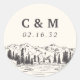 Os autocolantes russos para o seu casamento ao ar livre, floresta ou aventureiro, uma ilustração feita à mão de picos de montanha, pinheiros e um rio que flui, com suas iniciais ou monograma e data de casamento em letra de bloco.