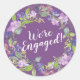 Fundo roxo profundo com grandes flores roxas claras e folhas verdes. Linda camada de aquarela nos rodeia. Estamos encantados, escritos em letras brancas brilhantes. Use como um selo de envelope em anúncios de noivado e convites para noivados.