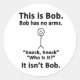 Para o amante sarcasmo em todos nós. Veja esta testemunha: "Este é Bob. Bob Não Tem Armas. Toc. Quem é? Não é Bob. design no roupa e presentes.