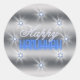 Este belo design de adesivo apresenta oito estrelas cintilantes de David em um array em torno do texto 'Happy Hanukkah'. O fundo é um gradiente prateado circulado por estrelas brilhantes brancas.