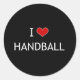 "I Love Handball", letras brancas sobre fundo preto, adesivo redondo.