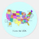 Adesivo Redondo Eu amo os EUA, mapa dos Estados Unidos