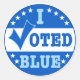 Aqui está um adesivo para Democratas para o Dia das Eleições e depois (e antes se você votar cedo). Apresenta um círculo azul junto com estrelas brancas e contendo as palavras "I VOTED BLUE" O "v" em "votação" é uma marca de verificação azul.