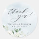 A moderna cor aquática Eucalyptus Greenery e floral branco em fundo azul empoeirado, obrigado de tendências que você escreve com nomes de casais e data de casamento, elegante e na moda, obrigado excelente você favorece adesivos para casamento rústico, casamento botânico e casamento de praia em primavera e verão. Ver todas as peças correspondentes na coleção