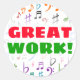 Este design de adesivo apresenta um padrão que envolve várias notas de música e símbolos de notação de música coloridos em várias cores. Também apresenta o encorajador ditado "TRABALHO EXCELENTE!" em texto vermelho e verde. Os adesivos como estes poderiam talvez ser usados por um professor, um educador ou um tutor para reconhecer encorajarem um estudante que tenha feito bem em um teste, teste, papel, projeto ou alguma outra tarefa acadêmica. [~Z0000117]