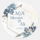 É fácil editar a ilustração das folhas azuis-cinzas enquadradas em ouro hexágono O adesivo de casamento é apresentado por uma estrutura dourada, iniciais da noiva e do noivo e a data do evento.