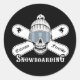 This monochrome illustration featuring a skull wearing winter goggles and a knit cap, crossed with snowboard shapes. Strong contrast line art and sharp typography create an edgy alpine-inspired visual suited for winter sports enthusiasts and graphic art fans.