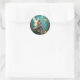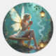 Um belo adesivo com uma fada sentada sobre um monstro numa floresta encantada acesa por lanternas bebendo uma xícara de café quente.