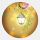Uma fada bonito de borboletas com asas de anjo rosa descansando sobre uma videira perto de uma lanterna brilhante com folhas e bolhas flutuando pelo ar.