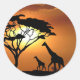 Uma girafa-mãe e o seu vitelo preparam-se para se acalmar durante a noite sob uma Acácia. Computação de Kathie Miller.