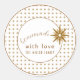 Crie adesivos para rotular seus biscoitos caseiros, doces, doces, guloseimas, favoritos para festas e muito mais apresentando um design de floco de neve dourado em um fundo branco nítido com borda padrão de starburst dourada e sua mensagem em caracteres na moda. Personalize para seus presentes de férias caseiros.