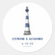 Um tipo de farol desenhado em um tema de cor azul e branca. Os nomes dos casais e a data estão abaixo. Esta é uma boa adição para enviar convites, cartões de Rsvp, e até adicioná-los aos favores do casamento.