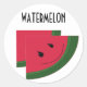 Duas fatias de melancia vermelha suculenta uma com um rosto. Uma crosta verde brilhante.