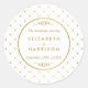Estes adesivos são perfeitos para qualquer casal planejando uma celebração moderna de casamento. O design apresenta um padrão de efeito de folha na moda dourada sobre um fundo branco limpo com uma estrutura decorativa de borda e é finalizado com uma redação elegante e editável. O design simples pode ser personalizado para se adequar ao seu evento especial e será o favor perfeito para qualquer festa de tendências, incluindo chás de panela, noivados, chás de casamento, festas de aniversário e muito, muito mais.