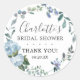 Sticker perfeito para selar os bilhetes de agradecimento ou favores do chá de noiva. Flores e folhagens azuis empoeiradas criam uma bela coroa botânica. Ela cerca o nome da noiva. A palavra chá de noiva, obrigado e data. Este adesivo de favor de chá de noiva faz parte da coleção Chá de Noiva Floral Azul Poeirento. Você encontrará convites e suprimentos para festas para tornar o planejamento do seu chá de noiva divertido e fácil!