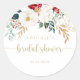 Este adesivo de favor de chá de noiva floral dourado clássico é perfeito para um chá de noiva rústico. O design apresenta flores e frutas brancas, bordô e douradas em aquarela com folhagens verdes dispostas em buquês elegantes.