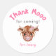 Tema da vaca russa, o adesivo de festa de aniversário favorito da moça que apresenta a ilustração aquática de uma vaca em terras altas com uma flor rosa. O texto diz "obrigado muoo por vir!"