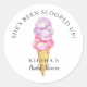 Adesivo de favor de chá de noiva caprichoso e doce com ilustração em aquarela de bolas de sorvete rosa e roxo em um cone de waffle. O texto diz "Ela foi servida!"