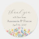 Adicione um toque final doce aos seus favores de noivado com este charmoso adesivo de agradecimento. Projetado com flores silvestres em aquarela em tons alegres de jardim, este adesivo redondo apresenta fontes elegantes de caligrafia e serifa, personalizadas com os nomes e datas do casal. Perfeito para selar sacos de favor, caixas ou envelopes em celebrações de noivado na primavera ou ao ar livre. Uma maneira linda de compartilhar sua gratidão com os convidados em estilo floral.