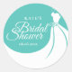 Um chá de panela de chic favorece adesivo com um vestido elegante de casamento em um fundo azul de safira com um belo texto de roteiro e todos os seus detalhes especiais de chá de panela totalmente personalizados em texto chico. Você pode personalizar a cor de fundo para coordenar com seu tema de casamento.