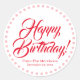 Feliz aniversário vermelho nome de script personalizado favorece nomes Classic Round Sticker e data cercada por uma delicada camada redonda de flocos de neve bonitos em vermelho e branco