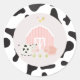 Vinhetas seladas de invólucro de festa de aniversário de animais fazenda com impressão de vaca e cascas rosa.