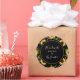 Feita à mão com adesivos de amor com um padrão elegante e na moda. Bonito girassóis amarelos e folhas verdes cercadas por delicadas cadeias de ouro. Fundo preto. Um círculo com uma borda falsa de folha de ouro colocada sobre cima com o seu dentro de texto personalizado.