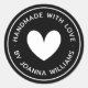 Etiquetas redondas com coração branco rodeadas pelo texto "feito à mão com amor" e o seu nome ou outro texto personalizado sobre fundo preto. Utilizar como autocolante para presentes e favores, embalagem do produto, etc.