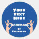 Par de mãos segurando a palavra "feito à mão" com nome e texto personalizados. A cor de fundo pode ser alterada.