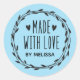 Um adesivo personalizado "feito com amor" sobre um fundo azul claro cercado por uma coroa de louros. Faça-o seu adicionando seu próprio nome. Um bonito toque final para todos os presentes feitos à mão. Projetado para você pelo Blackberry Boulevard.