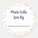 Um adesivo "Made With Love By" com estrelas douradas e um roteiro azul da meia-noite.