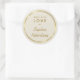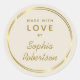Feito com o Love Personalizado Dourado na etiqueta do produto Cream Classic Round Sticker... Um adesivo em ouro na moda e creme redondo para seus presentes feitos à mão, comidas caseiras ou produtos caseiros à venda. Os círculos de olhares metálicos dourados desenhados à mão rebordam o texto que diz "Made with Love by", seguido do seu nome na tipografia de argumentos de tendências. Você pode mudar facilmente o nome e todos os outros textos no modelo de personalização, assim como o tamanho dos rótulos, dependendo do que você está usando. O gráfico aqui mostra o adesivo grande.