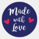 Um adesivo com as palavras 'made with love' escrito em branco num marinho azul com dois corações de amor vermelhos. Você pode mudar a cor de fundo para qualquer coisa que se encaixe no seu item, mas ele fica particularmente bom em blues escuros e roxo, preto ou marrom. Isso seria perfeito para qualquer pessoa que desse presentes ao DIY ou caseiro a amigos e familiares ou para qualquer pessoa que queira decorar seus produtos com um adesivo para mostrar que foi feito à mão.