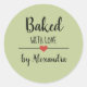 Um adesivo moderno "cozido com amor" com uma fonte preta em um fundo verde embelezado por um coração vermelho bonito. Personalizar texto.